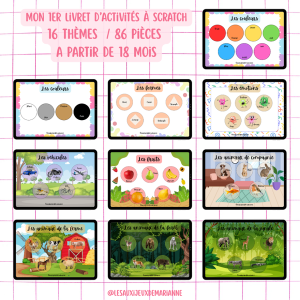 - Reconnaissance visuelle : identifier les formes, objets, couleurs ou animaux selon le thème du livret.